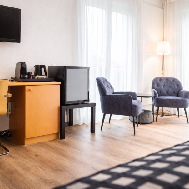 In den Komfort- und Premiumzimmern ergänzt ein Welcome Tray die Ausstattung. Dieses umfasst einen Kaffeekapselautomaten, einen Wasserkocher sowie Kaffee- und Teezubehör – für zusätzlichen Komfort direkt im Zimmer.