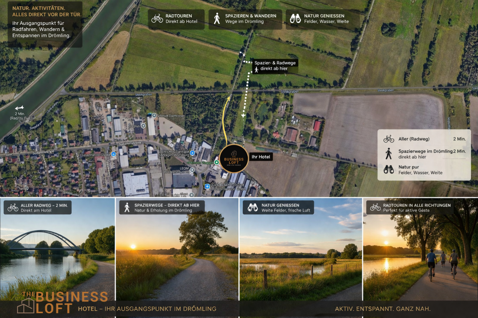 Direkt ab dem Hotel starten Rad- und Spazierwege entlang von Wasser, Feldern und Naturflächen des Drömlings.