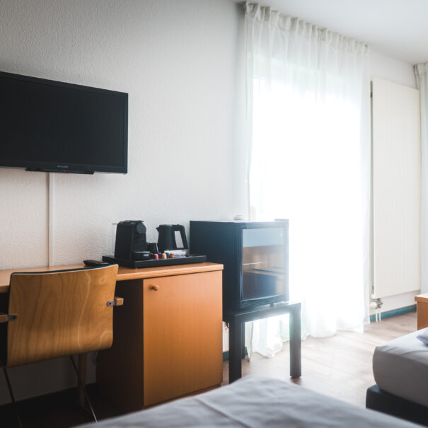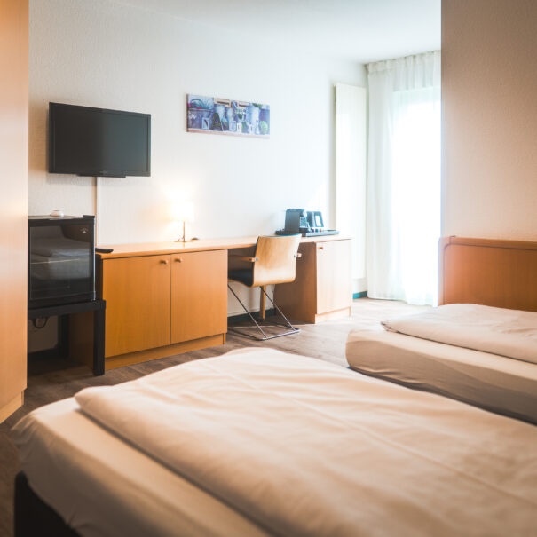 Unsere Standard Doppelzimmer sind praktisch und komfortabel eingerichtet – ideal für kurze und längere Aufenthalte. Zwei separate Einzelbetten (Twin-Beds), auf Wunsch auch zusammengestellt, bieten Flexibilität für jede Belegung. Zur Ausstattung gehören Schreibtisch, TV, Kleiderschrank, Garderobe und eine praktische Kofferablage. Das moderne Bad mit Dusche, WC und Haartrockner sorgt für zeitgemäßen Komfort. Ein Kühlschrank sowie ein Welcome-Tray mit Kapselkaffeemaschine, Wasserkocher, Tee und Kaffee runden das Angebot ab. Geeignet für Einzel- oder Doppelbelegung.