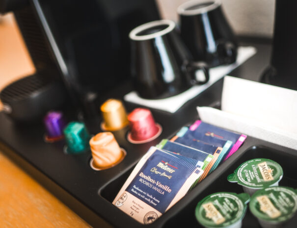 In jedem Doppelzimmer erwartet Sie unser Welcome Tray mit Wasserkocher sowie Tee- und Kaffeeauswahl – ideal für den ersten Kaffee am Morgen oder eine entspannte Tasse Tee am Abend. Zusätzlich stellen wir jedem Gast eine kostenfreie Flasche Wasser zur Begrüßung bereit.