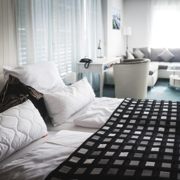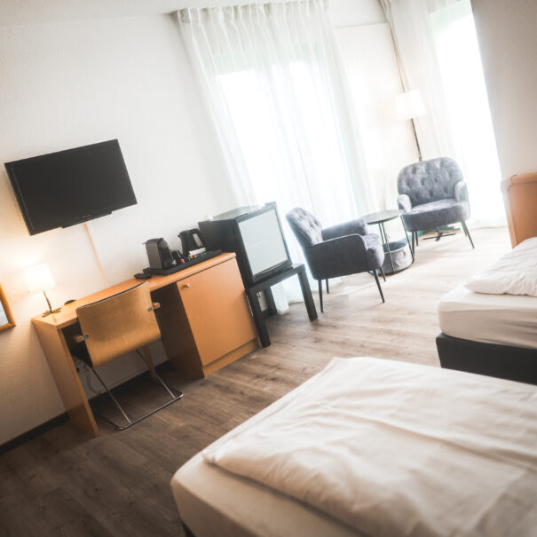 Unsere Premium Doppelzimmer überzeugen durch ihre besonders helle Lage mit bodentiefen Fensterelementen. Zwei separate Einzelbetten (Twin-Beds), die auf Wunsch zusammengestellt werden können, sorgen für Flexibilität und hohen Schlafkomfort. Eine gemütliche Sitzecke mit Tisch und Sesseln lädt zum Verweilen ein. Zur Ausstattung gehören außerdem Fernseher, Kleiderschrank, Garderobe und eine praktische Kofferablage. Das eigene Bad ist mit Dusche, WC und Haartrockner ausgestattet. Zusätzlich stehen Ihnen ein Kühlschrank sowie ein Welcome-Tray mit Kapselkaffeemaschine, Wasserkocher, Tee und Kaffee zur Verfügung. Geeignet für Einzel- oder Doppelbelegung – ideal für Gäste, die Wert auf Komfort, Licht und eine wohnliche Atmosphäre legen.