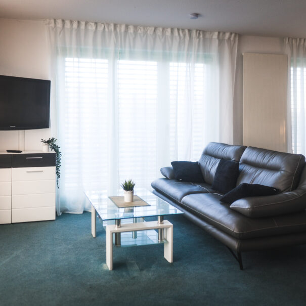 Apartment Small – kompakt & komfortabel Unser Apartment Small ist ideal für Alleinreisende, die Wert auf Komfort und Funktionalität legen. Gleichzeitig bietet es mit dem 140 cm Boxspringbett auch Platz für zwei Personen. Auf rund 36 m² erwartet Sie ein gemütlicher Wohn- und Schlafbereich mit Schreibtisch, Stuhl, TV, Kleiderschrank, Sessel und Couchtisch. Der separate Eingangsbereich verfügt über eine Garderobe sowie eine praktische Küchenzeile mit 2-Platten-Herd, Kühlschrank und Mikrowelle. Geschirr, Besteck, Kochgeschirr und Pfannen sind vollständig vorhanden. Das moderne Bad ist mit Waschbecken, Spiegelschrank, Dusche, WC und Haartrockner ausgestattet.