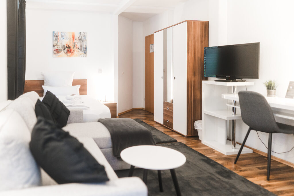 Unser großzügiges Apartment Large (ca. 35 m²) bietet alles, was man für einen komfortablen und unabhängigen Aufenthalt braucht: ein 140 cm französisches Bett (Grandlit), eine vollständig ausgestattete Küchenzeile, eine große Couch mit Recamiere (ausziehbar als Schlafcouch) sowie einen gemütlichen Wohn- und Arbeitsbereich. Ideal für Alleinreisende, Paare oder Langzeitgäste, die viel Platz und ein wohnliches Ambiente schätzen.