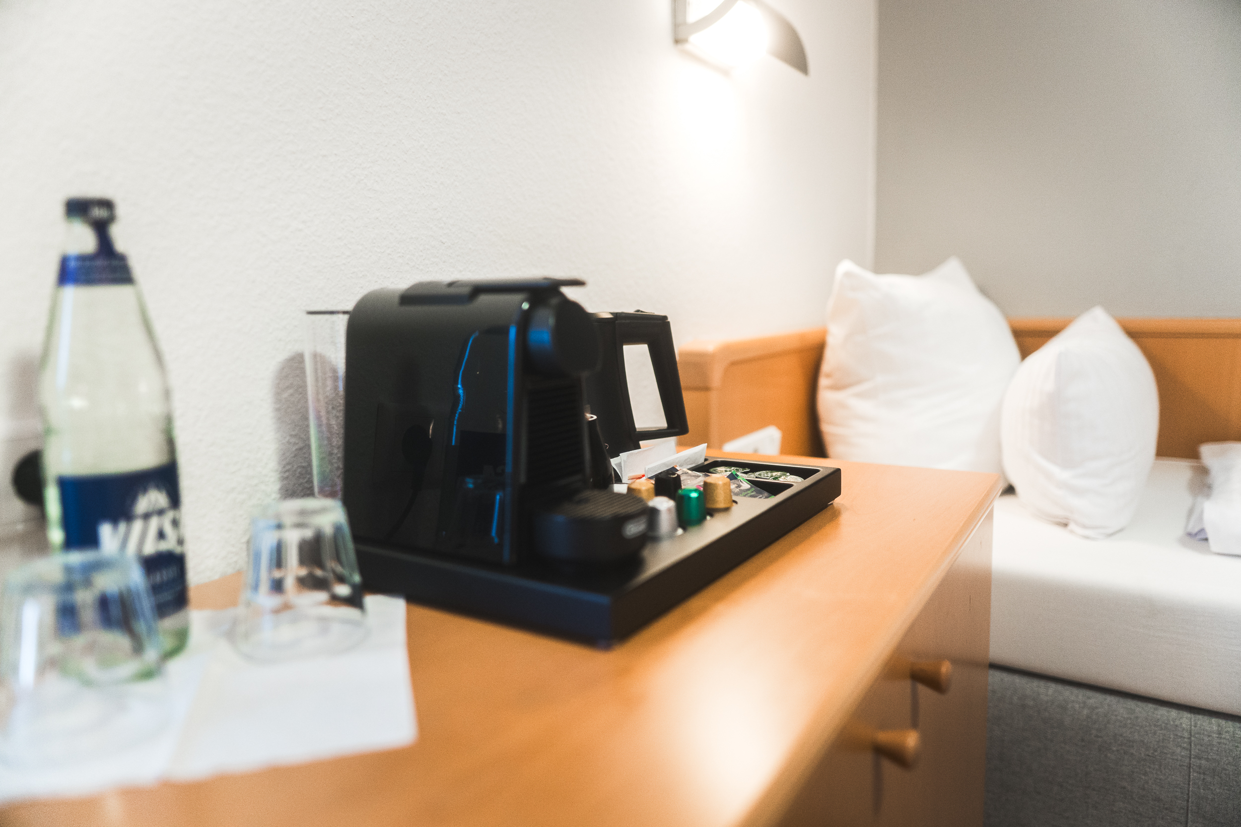 Zur weiteren Ausstattung gehören ein moderner Flachbild-TV, eine gemütliche Sitzgelegenheit, ein Kühlschrank sowie ein Welcome-Tray mit Kapselkaffeemaschine, Wasserkocher, Tee, Kaffee und Mineralwasser.