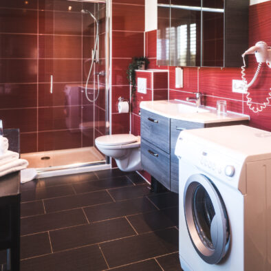 Badezimmer: Dusche, WC, Haartrockner, Pflegeprodukte, Waschmaschine, Spiegelschrank