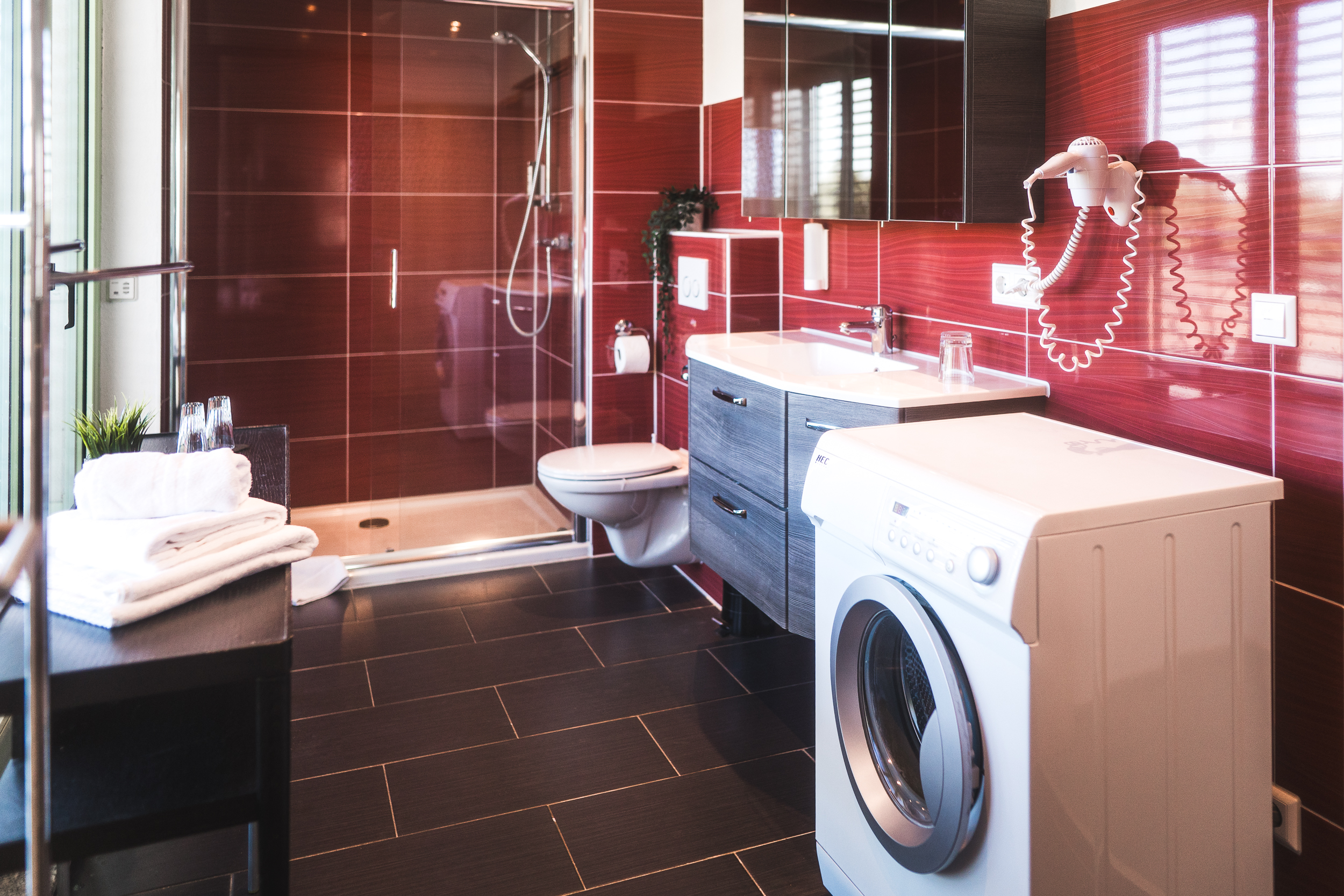 Das moderne Badezimmer ist mit einer großen Dusche, Spiegelschrank, Haartrockner, Pflegeprodukten sowie einer Waschmaschine ausgestattet – ideal auch für längere Aufenthalte.