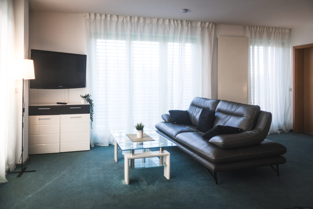 Der helle Wohn- und Schlafbereich überzeugt mit einem modernen Lounge-Sofa mit verstellbarer Rückenlehne, einem Schreibtisch und einem großzügigen Kleiderschrank. Für Unterhaltung sorgen zwei Flachbild-TVs – einer im Wohnbereich, ein weiterer im Küchen-/Essbereich.